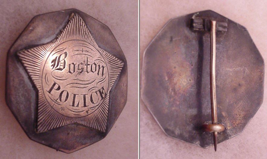 A oblong six-pointed brass star is issued to the entire police department. This badge is designed to be worn on the left lapel of the coat.